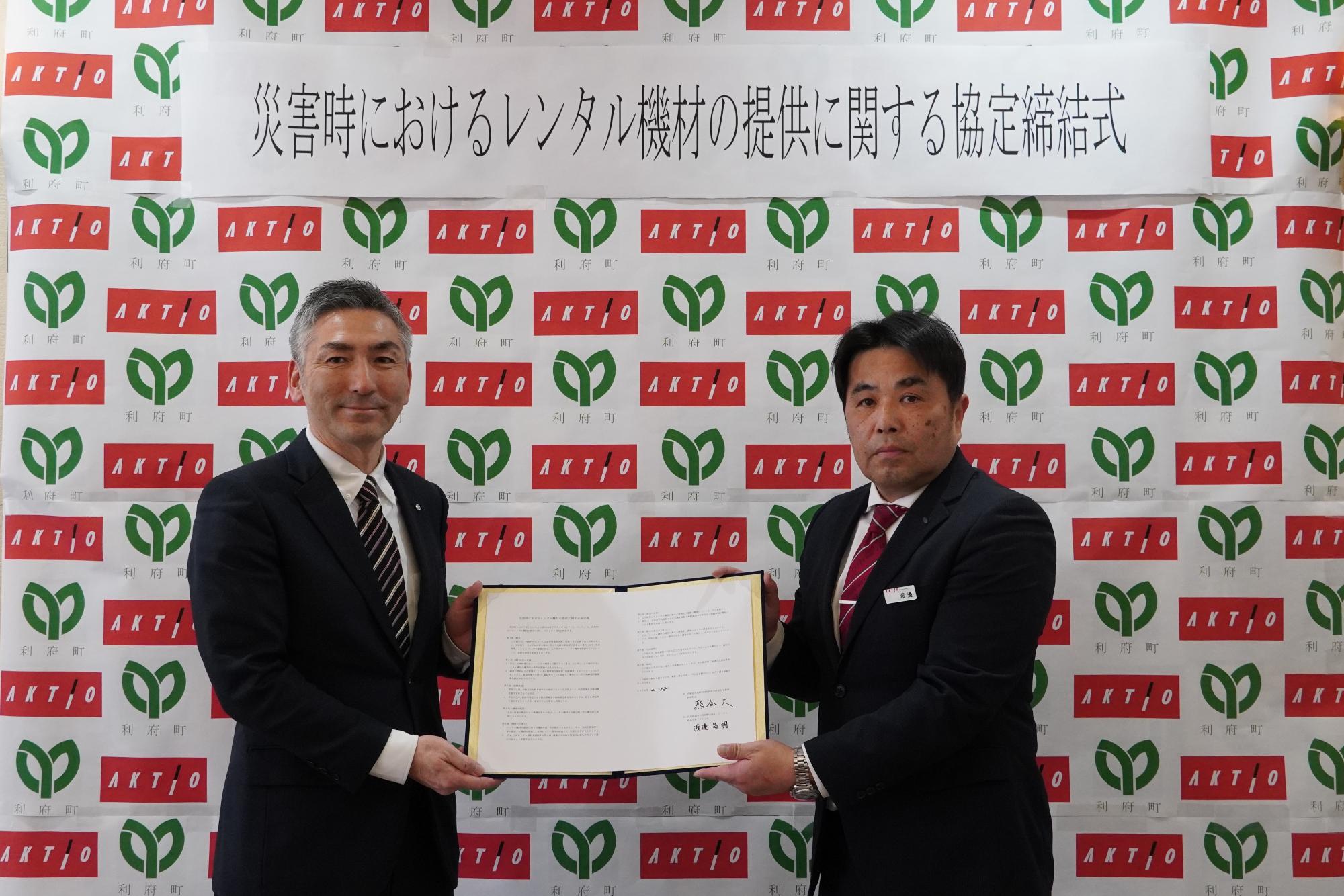 株式会社アクティオと本町は、利府町内において災害が発生し又は発生するおそれがある場合及び大規模な事故等が発生した場合に利府町の要請に応じ、株式会社アクティオが保有するレンタル機材を優先的に提供し住民の安心安全な暮らしに資することを目的に、令和8年2月18日に協定締結式を開催いたしました。