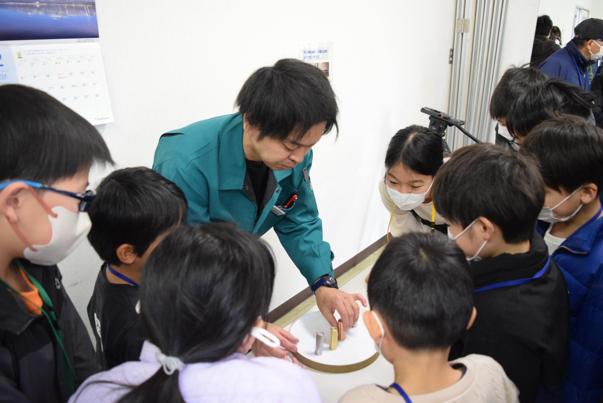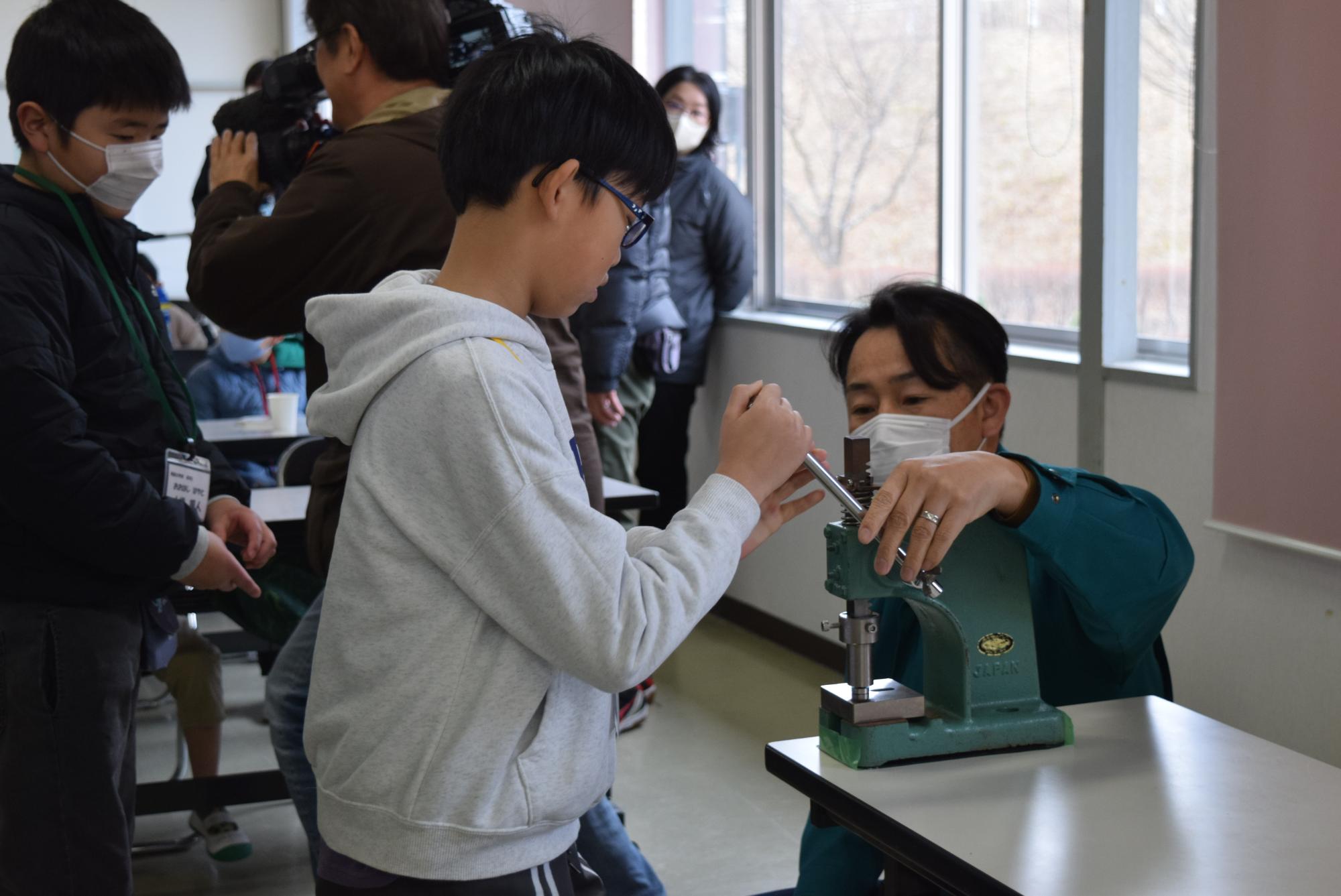 金属コマ全国大会で優勝の経験がある岩沼精工の技術者から、金属のしくみやオリジナルの金属コマ製作を教えてくれました。