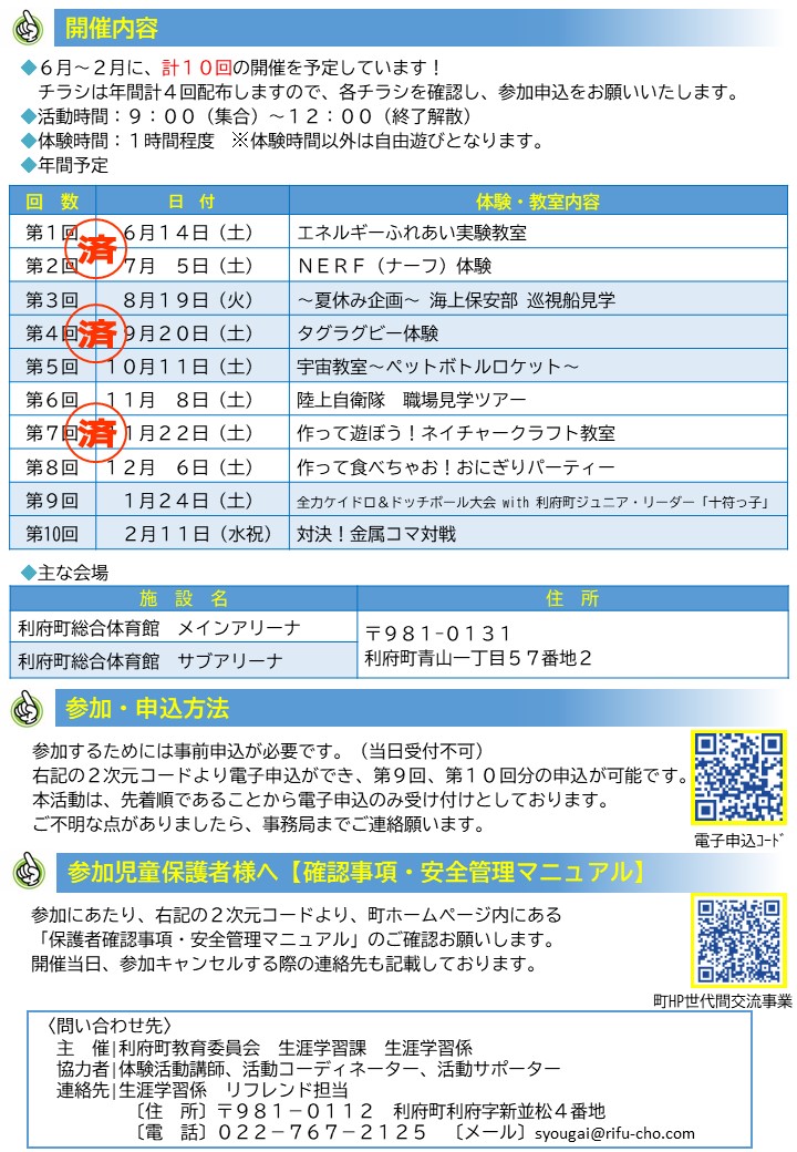 利府町内のすべての小学生が対象で、講師などをお呼びした体験活動などの他に、色々な学年や学校の友達と話したり、勉強や読書、遊んだりしながら楽しい時間を過ごす場所です。地域サポーターや関係団体の協力を得ながら、地域の特色(ひと、もの、こと)を活かした活動を行います。また、活動を通して、世代を超えたつながりや相互理解を深めるとともに、子どもたちの自主性や社会性、協調性を育むことを目的としています。